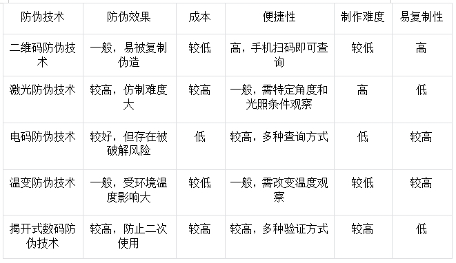 為了更直觀地了解各種防偽技術的特點,我們可以從多個維度進行對比分析,以下是一個簡單的對比表格: