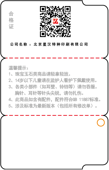 防偽吊牌是承載飾品商標(biāo)的有效載體,現(xiàn)在許多大型企業(yè)為了維護(hù)自己的品牌權(quán)益都制作了專屬于自己的防偽標(biāo)識,標(biāo)識上有一些廠家資料的簡單介紹,如廠家名稱、產(chǎn)品名稱、規(guī)格型號、產(chǎn)品等級、儲藏方法、檢驗(yàn)合格證明等。珠寶商家也是一樣,一般在珠寶吊牌上也都會標(biāo)注這些基本信息,好讓消費(fèi)者可以更好的了解商家信息。